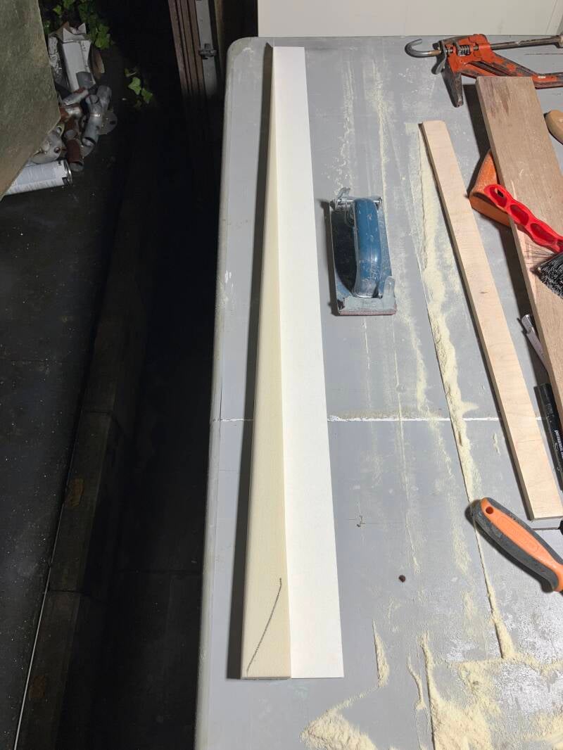 Nadat de juiste vormen zijn gecreëerd, lijm ik een 4mm dikke polyester strook op de geschuurde purschuim platen. Deze strook fungeert als een basis en montage laag die extra sterkte en structuur biedt.